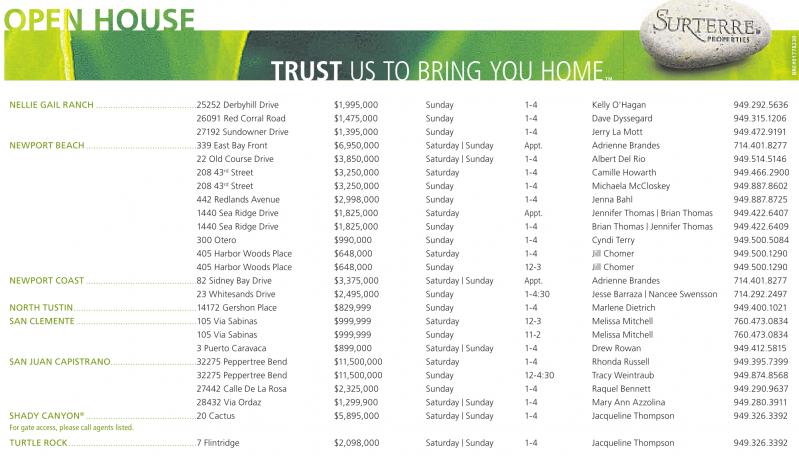 NELLIE GAIL RANCH .........................................25252 Derbyhill Drive $1,995,000 Sunday 1-4 Kelly O'Hagan 949.292.5636 26091 Red Corral Road $1,475,000 Sunday 1-4 Dave Dyssegard 949.315.1206 27192 Sundowner Drive $1,395,000 Sunday 1-4 Jerry La Mott 949.472.9191 NEWPORT BEACH .............................................339 East Bay Front $6,950,000 Saturday | Sunday Appt. Adrienne Brandes 714.401.8277 22 Old Course Drive $3,850,000 Saturday | Sunday 1-4 Albert Del Rio 949.514.5146 208 43 rd Street $3,250,000 Saturday 1-4 Camille Howarth 949.466.2900 208 43 rd Street $3,250,000 Sunday 1-4 Michaela McCloskey 949.887.8602 442 Redlands Avenue $2,998,000 Sunday 1-4 Jenna Bahl 949.887.8725 1440 Sea Ridge Drive $1,825,000 Saturday Appt. Jennifer Thomas | Brian Thomas 949.422.6407 1440 Sea Ridge Drive $1,825,000 Sunday 1-4 Brian Thomas | Jennifer Thomas 949.422.6409 300 Otero $990,000 Sunday 1-4 Cyndi Terry 949.500.5084 405 Harbor Woods Place $648,000 Saturday 1-4 Jill Chomer 949.500.1290 405 Harbor Woods Place $648,000 Sunday 12-3 Jill Chomer 949.500.1290 NEWPORT COAST .............................................82 Sidney Bay Drive $3,375,000 Saturday | Sunday Appt. Adrienne Brandes 714.401.8277 23 Whitesands Drive $2,495,000 Sunday 1-4:30 Jesse Barraza | Nancee Swensson 714.292.2497 NORTH TUSTIN..................................................14172 Gershon Place $829,999 Sunday 1-4 Marlene Dietrich 949.400.1021 SAN CLEMENTE .................................................105 Via Sabinas $999,999 Saturday 12-3 Melissa Mitchell 760.473.0834 105 Via Sabinas $999,999 Sunday 11-2 Melissa Mitchell 760.473.0834 3 Puerto Caravaca $899,000 Saturday | Sunday 1-4 Drew Rowan 949.412.5815 SAN JUAN CAPISTRANO...................................32275 Peppertree Bend $11,500,000 Saturday 1-4 Rhonda Russell 949.395.7399 32275 Peppertree Bend $11,500,000 Sunday 12-4:30 Tracy Weintraub 949.874.8568 27442 Calle De La Rosa $2,325,000 Sunday 1-4 Raquel Bennett 949.290.9637 28432 Via Ordaz $1,299,900 Saturday | Sunday 1-4 Mary Ann Azzolina 949.280.3911 SHADY CANYON ® .............................................20 Cactus $5,895,000 Saturday | Sunday 1-4 Jacqueline Thompson 949.326.3392 Forgateaccess,pleasecallagentslisted. TURTLE ROCK....................................................7 Flintridge $2,098,000 Saturday | Sunday 1-4 Jacqueline Thompson 949.326.3392