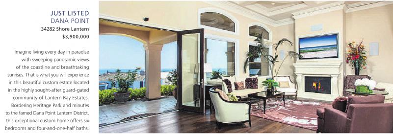 JUST LISTED DANA POINT 34282 Shore Lantern $3,900,000 Imagine living every day in paradise with sweeping panoramic views of the coastline and breathtaking sunrises. That is what you will experience in this beautiful custom estate located in the highly sought-after guard-gated community of Lantern Bay Estates. Bordering Heritage Park and minutes to the famed Dana Point Lantern District, this exceptional custom home offers six bedrooms and four-and-one-half baths.