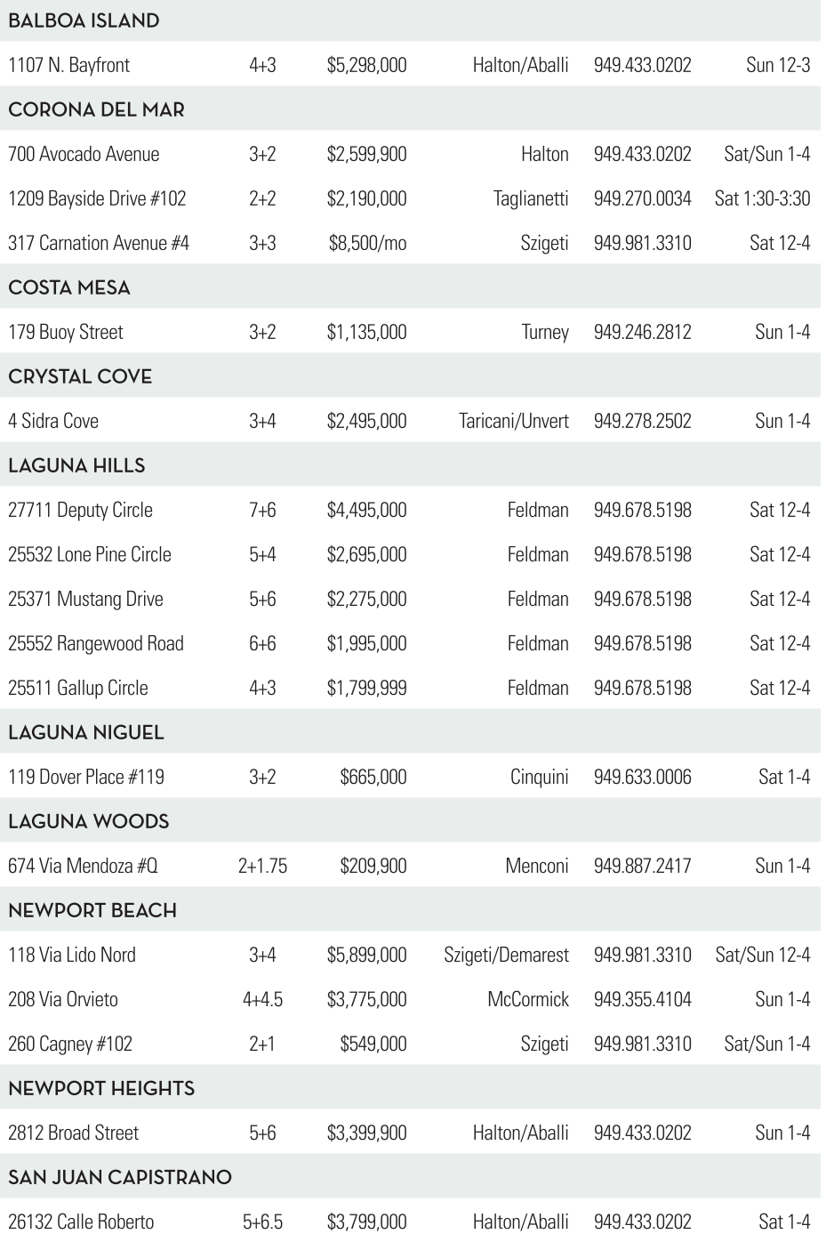 BALBOAIS ND 1107 N. Bayfront 4+3 $5,298,000 Halton/Aballi 949.433.0202 Sun 12-3 CORONA DEL MAR 700 Avocado Avenue 3+2 $2,599,900 Halton 949.433.0202 Sat/Sun 1-4 1209 Bayside Drive #102 2+2 $2,190,000 Taglianetti 949.270.0034 Sat 1:30-3:30 317 Carnation Avenue #4 3+3 $8,500/mo Szigeti 949.981.3310 Sat 12-4 COSTA MESA 179 Buoy Street 3+2 $1,135,000 Turney 949.246.2812 Sun 1-4 CRYSTAL COVE 4Sidra Cove 3+4 $2,495,000 Taricani/Unvert 949.278.2502 Sun 1-4 GUNA HILLS 27711 Deputy Circle 7+6 $4,495,000 Feldman 949.678.5198 Sat 12-4 25532 Lone Pine Circle 5+4 $2,695,000 Feldman 949.678.5198 Sat 12-4 25371 Mustang Drive 5+6 $2,275,000 Feldman 949.678.5198 Sat 12-4 25552 Rangewood Road 6+6 $1,995,000 Feldman 949.678.5198 Sat 12-4 25511 Gallup Circle 4+3 $1,799,999 Feldman 949.678.5198 Sat 12-4 GUNA NIGUEL 119 Dover Place #119 3+2 $665,000 Cinquini 949.633.0006 Sat 1-4 GUNA WOODS 674 ViaMendoza #Q 2+1.75 $209,900 Menconi 949.887.2417 Sun 1-4 NEWPORTBEACH 118 ViaLido Nord 3+4 $5,899,000 Szigeti/Demarest 949.981.3310 Sat/Sun 12-4 208 ViaOrvieto 4+4.5 $3,775,000 McCormick 949.355.4104 Sun 1-4 260 Cagney #102 2+1 $549,000 Szigeti 949.981.3310 Sat/Sun 1-4 NEWPORTHEIGHTS 2812 Broad Street 5+6 $3,399,900 Halton/Aballi 949.433.0202 Sun 1-4 SANJUANCAPISTRANO 26132 Calle Roberto 5+6.5 $3,799,000 Halton/Aballi 949.433.0202 Sat 1-4