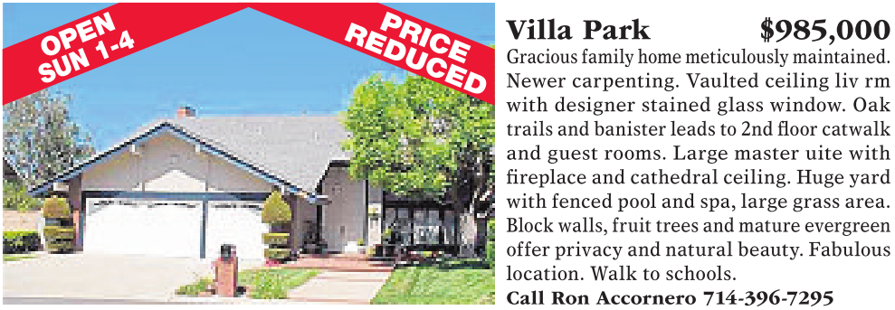 Villa Park $985,000 Gracious familyhomemeticulouslymaintained. Newer carpenting. Vaulted ceiling liv rm with designer stained glass window. Oak trailsand banister leadsto2nd floorcatwalk and guest rooms. Large master uite with fireplace and cathedral ceiling. Huge yard with fenced pool and spa, large grass area. Blockwalls, fruittrees andmatureevergreen offerprivacy andnatural beauty. Fabulous location. Walk to schools. Call Ron Accornero 714-396-7295