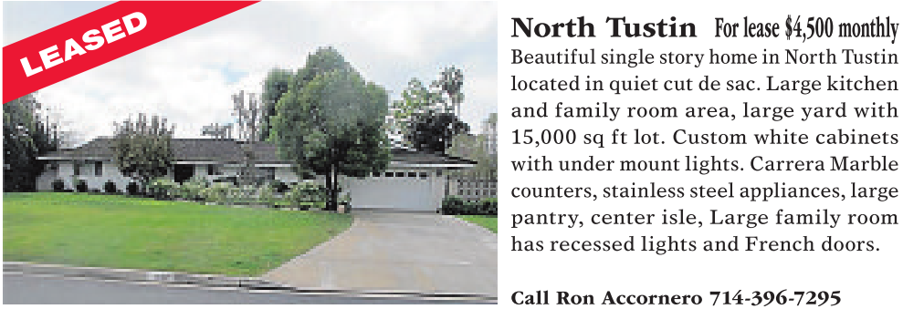North Tustin For lease $4,500 monthly Beautifulsinglestory home in NorthTustin locatedinquiet cutdesac.Large kitchen and family room area, large yard with 15,000 sq ft lot. Custom white cabinets with undermount lights. CarreraMarble counters,stainless steel appliances,large pantry, center isle, Large family room has recessed lights and French doors. Call Ron Accornero 714-396-7295