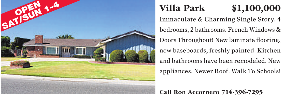 Villa Park $1,100,000 Immaculate &Charming Single Story.4 bedrooms,2bathrooms. French Windows& DoorsThroughout! Newlaminate flooring, newbaseboards,freshly painted. Kitchen andbathrooms have been remodeled. New appliances.Newer Roof. Walk To Schools! Call Ron Accornero 714-396-7295
