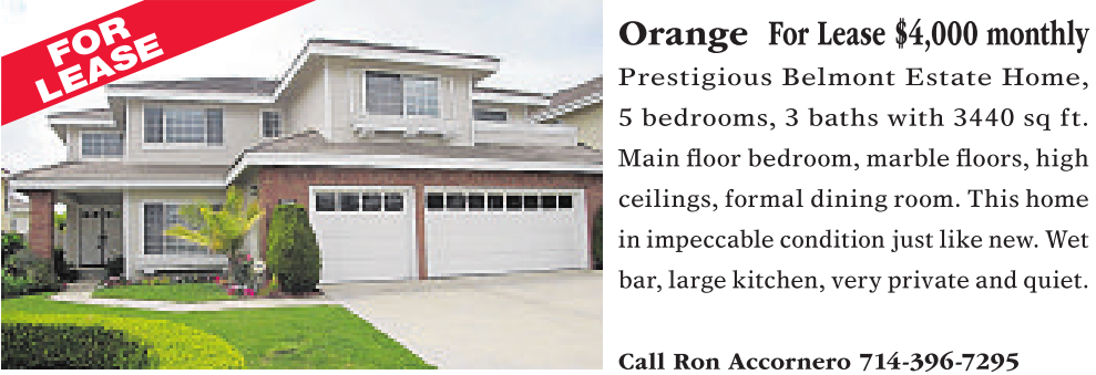 Orange For Lease $4,000 monthly Prestigious Belmont Estate Home, 5 bedrooms, 3 baths with 3440 sq ft. Main floorbedroom,marble floors,high ceilings, formal dining room.Thishome in impeccablecondition just like new. Wet bar, largekitchen,veryprivate andquiet. Call Ron Accornero 714-396-7295