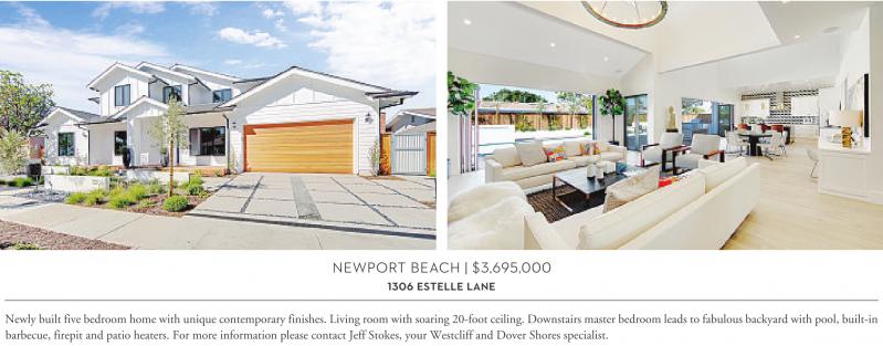 NEWPORT BEACH | $3,695,000 1306 estelle lane Newly built five bedroom home with unique contemporary finishes. Living room with soaring 20-foot ceiling. Downstairs master bedroom leads to fabulous backyard with pool, built-in barbecue, firepit and patio heaters. For more information please contact Jeff Stokes, your Westcliff and Dover Shores specialist.