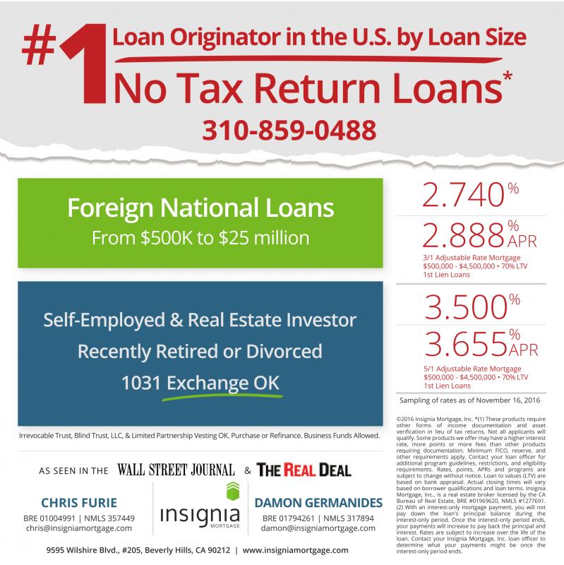 ©2016 Insignia Mortgage, Inc. *(1) These products require other forms of income documentation and asset verification in lieu of tax returns. Not all applicants will qualify. Some products we offer may have ahigher interest rate, more points or more fees than other products requiring documentation. Minimum FICO, reserve, and other requirements apply. Contact your loan officer for additional program guidelines, restrictions, and eligibility requirements. Rates, points, APRs and programs are subject to change without notice. Loan to values (LTV) are based on bank appraisal. Actual closing times will vary based on borrower qualifications and loan terms. Insignia Mortgage, Inc., is a real estate broker licensed by the CA Bureau of Real Estate, BRE #01969620, NMLS #1277691. (2) With an interest-only mortgage payment, you will not pay down the loan's principal balance during the interest-only period. Once the interest-only period ends, your payments will increase to pay back the principal and interest. Rates are subject to increase over the life of the loan. Contact your Insignia Mortgage, Inc. loan officer to determine what your payments might be once the interest-only period ends.