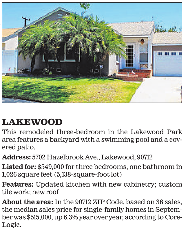 LAKEWOOD This remodeled three-bedroom in the Lakewood Park area features a backyard with a swimming pool and a covered patio. Address: 5702 Hazelbrook Ave., Lakewood, 90712 Listed for: $549,000 for three bedrooms, one bathroom in 1,026 square feet (5,138-square-foot lot) Features: Updated kitchen with new cabinetry; custom tile work; new roof About the area: In the 90712 ZIP Code, based on 36 sales, the median sales price for single-family homes in September was $515,000, up 6.3% year over year, according to Core- Logic. See also