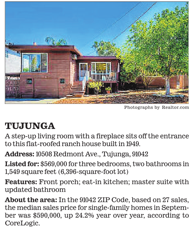 Photographs by Realtor.com TUJUNGA Astep-up living room with a fireplace sits off the entrance to this flat-roofed ranch house built in 1949. Address: 10508 Redmont Ave., Tujunga, 91042 Listed for: $569,000 for three bedrooms, two bathrooms in 1,549 square feet (6,396-square-foot lot) Features: Front porch; eat-in kitchen; master suite with updated bathroom About the area: In the 91042 ZIP Code, based on 27 sales, the median sales price for single-family homes in September was $590,000, up 24.2% year over year, according to CoreLogic.