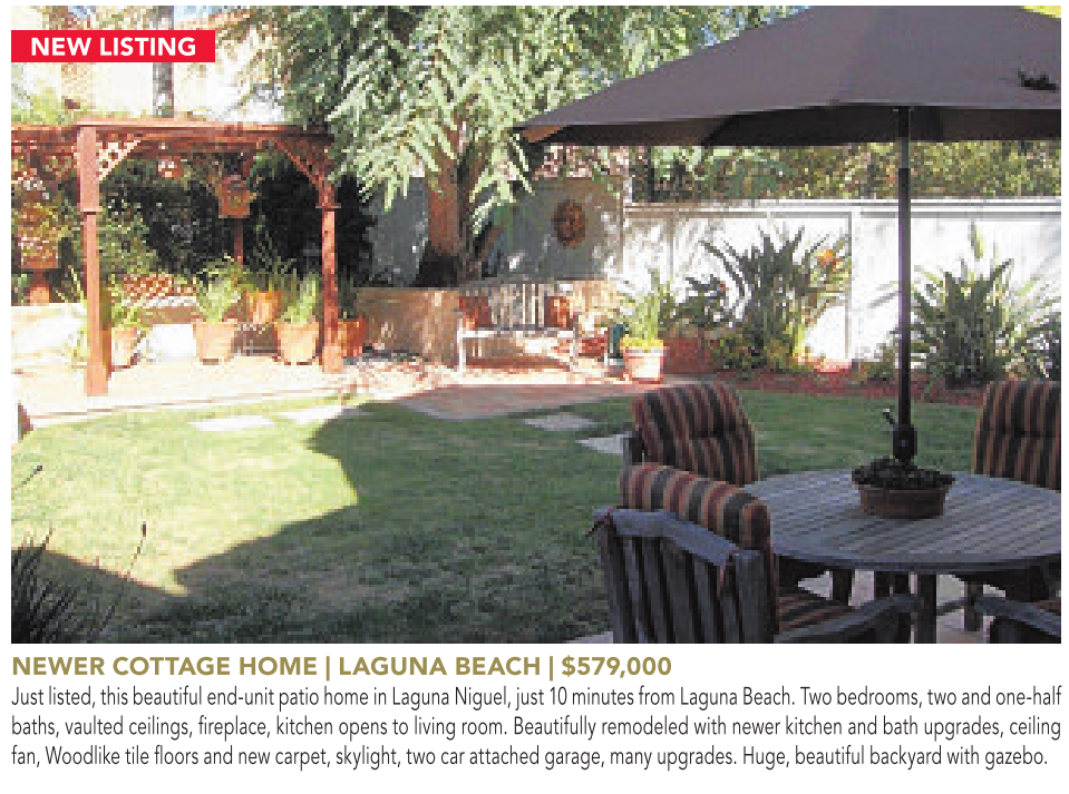 NEW LISTING NEWER COTTAGE HOME | LAGUNA BEACH | $579,000 Just listed, this beautiful end-unit patio home in Laguna Niguel, just 10minutes from Laguna Beach. Two bedrooms, two and one-half baths, vaulted ceilings, fireplace, kitchen opens to living room. Beautifully remodeled with newer kitchen and bath upgrades, ceiling fan, Woodlike tile floors and new carpet, skylight, two car attached garage, many upgrades. Huge, beautiful backyard with gazebo.