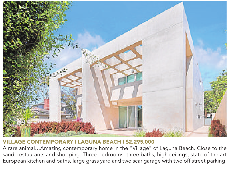 VILLAGE CONTEMPORARY l LAGUNA BEACH l $2,295,000 A rare animal…Amazing contemporary home in the “Village” of Laguna Beach. Close to the sand, restaurants and shopping. Three bedrooms, three baths, high ceilings, state of the art European kitchenand baths, large grass yard and two scar garage with two off street parking.