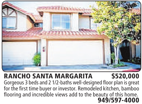 RANCHO SANTA MARGARITA $520,000 Gorgeous 3bedsand 21/2-baths well-designed floorplanisgreat for the firsttimebuyer or investor.Remodeledkitchen,bamboo flooring andincredible viewsadd to thebeauty of this home.