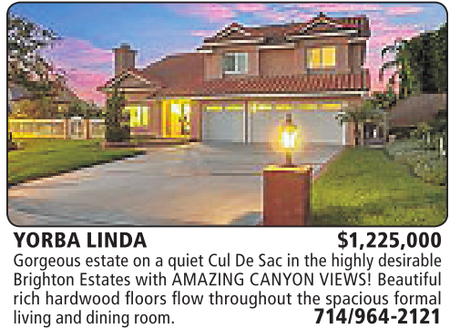 YORBA LINDA $1,225,000 Gorgeous estate on aquiet Cul DeSac in the highly desirable Brighton Estates with AMAZING CANYON VIEWS! Beautiful rich hardwood floors flow throughout the spacious formal living anddining room. 714/964-2121