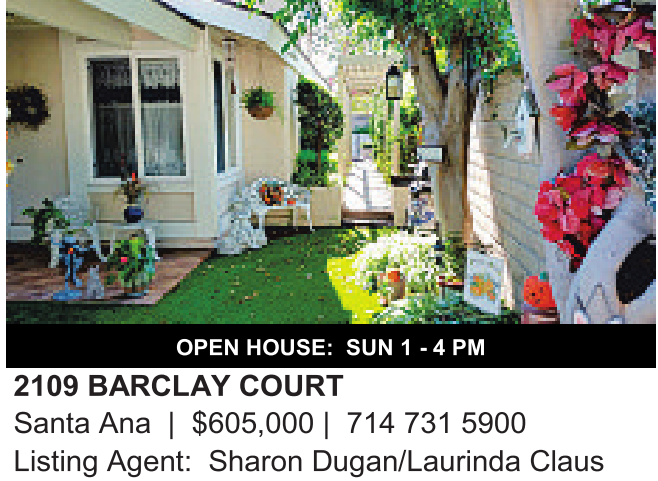 2109 BARCLAY COURT Santa Ana | $605,000 | 714 731 5900 Listing Agent: Sharon Dugan/Laurinda Claus