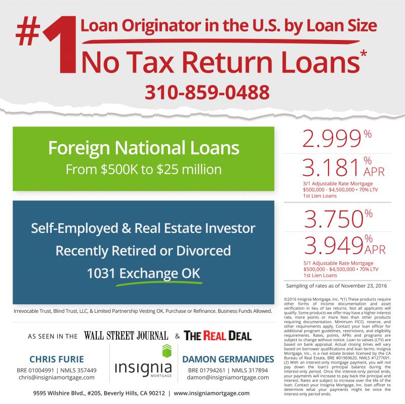 ©2016 Insignia Mortgage, Inc. *(1) These products require other forms of income documentation and asset verification in lieu of tax returns. Not all applicants will qualify. Some products we offer may have ahigher interest rate, more points or more fees than other products requiring documentation. Minimum FICO, reserve, and other requirements apply. Contact your loan officer for additional program guidelines, restrictions, and eligibility requirements. Rates, points, APRs and programs are subject to change without notice. Loan to values (LTV) are based on bank appraisal. Actual closing times will vary based on borrower qualifications and loan terms. Insignia Mortgage, Inc., is a real estate broker licensed by the CA Bureau of Real Estate, BRE #01969620, NMLS #1277691. (2) With an interest-only mortgage payment, you will not pay down the loan's principal balance during the interest-only period. Once the interest-only period ends, your payments will increase to pay back the principal and interest. Rates are subject to increase over the life of the loan. Contact your Insignia Mortgage, Inc. loan officer to determine what your payments might be once the interest-only period ends.