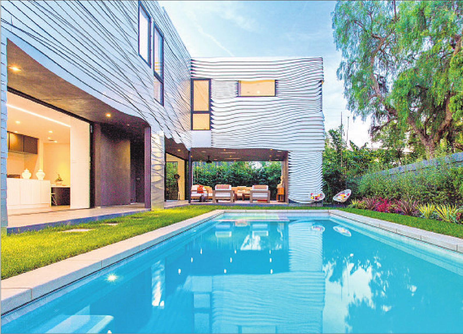 Layers of white aluminum and stained cedar blocks provide an undulating shell that appears to envelop the home, aptly called the Wave House. The dramatic design shelters a swimming pool and an outdoor theater that are separated from the living areas by sliding walls of glass.