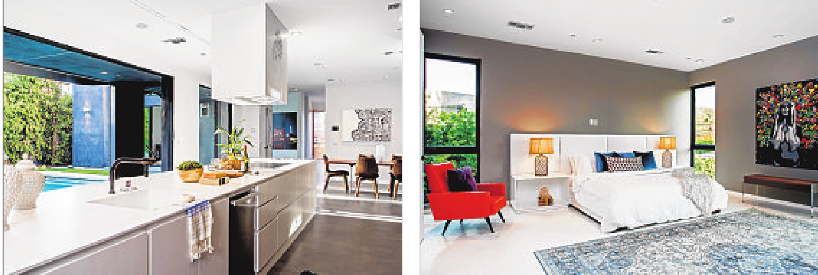 Features: White aluminum siding; stained cedar blocks; gated courtyard; open-plan living room with fireplace; modern kitchen; sliding glass walls; swimming pool and spa; outdoor theater; pavilion