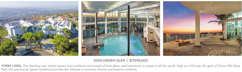 YORBA LINDA: This dazzling over 19,000 square foot architectural triumph of blue glass, steel and stone is unique in all the world. High on a hill near the gate of Chino Hills State Park, the spectacular gated residence provides the ultimate in luxurious interior and exterior comforts.