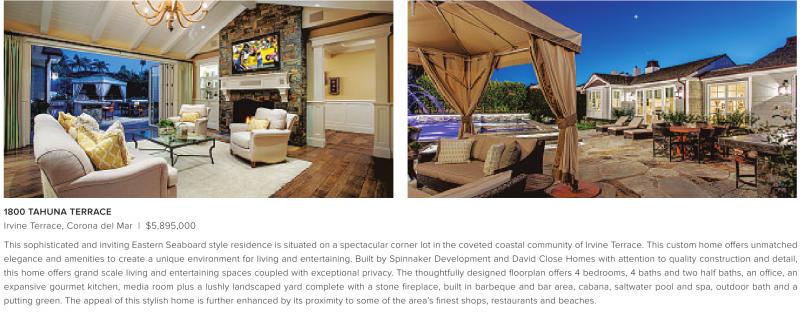 1800 TAHUNA TERRACE Irvine Terrace, Corona del Mar | $5,895,000 This sophisticated and inviting Eastern Seaboard style residence is situated on a spectacular corner lot in the coveted coastal community of Irvine Terrace. This custom home offers unmatched elegance and amenities to create a unique environment for living and entertaining. Built by Spinnaker Development and David Close Homes with attention to quality construction and detail, this home offers grand scale living and entertaining spaces coupled with exceptional privacy. The thoughtfully designed floorplan offers 4 bedrooms, 4 baths and two half baths, an office, an expansive gourmet kitchen, media room plus a lushly landscaped yard complete with a stone fireplace, built in barbeque and bar area, cabana, saltwater pool and spa, outdoor bath and a putting green. The appeal of this stylish home is further enhanced by its proximity to some of the area’s finest shops, restaurants and beaches.