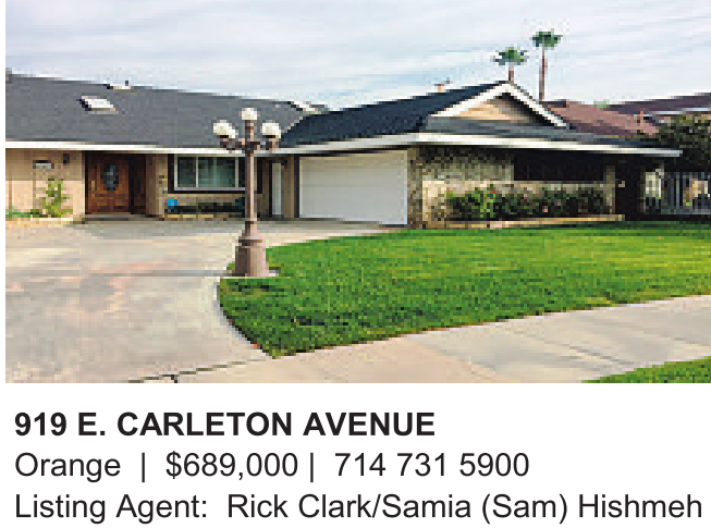 919 E. CARLETON AVENUE Orange | $689,000 | 714 731 5900 Listing Agent: Rick Clark/Samia (Sam) Hishmeh