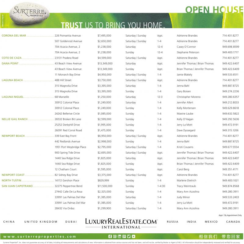 CORONA DEL MAR ..................................... 226 Poinsettia Avenue $7,495,000 Saturday | Sunday Appt. Adrienne Brandes 714.401.8277 507 Goldenrod Avenue $2,650,000 Saturday | Sunday 1-4 Adrienne Brandes 714.401.8277 704 Acacia Avenue, 2 $1,238,000 Saturday 12-4 Casey O’Connor 949.698.8599 704 Acacia Avenue, 2 $1,238,000 Sunday 12-4 Stephanie Peterson 949.400.1717 COTO DE CAZA ........................................... 23131 Pradera Road $4,599,000 Saturday | Sunday Appt. Adrienne Brandes 714.401.8277 DANA POINT ............................................... 43 Beach View Avenue $13,349,000 Saturday Appt. Jennifer Thomas | Brian Thomas 949.422.6407 43 Beach View Avenue $13,349,000 Sunday Appt. Brian Thomas | Jennifer Thomas 949.422.6409 11 Monarch Bay Drive $4,950,000 Saturday | Sunday 1-4 Jamie Blakely 949.533.6511 LAGUNA BEACH.......................................... 488 Hill Street $3,750,000 Saturday | Sunday Appt. Adrienne Brandes 714.401.8277 315 Magnolia Drive $3,395,000 Saturday 1-4 Jenna Bahl 949.887.8725 315 Magnolia Drive $3,395,000 Sunday 1-4 Gary Boisen 949.274.2236 LAGUNA NIGUEL......................................... 68 Marseille $1,250,000 Saturday 12-3 Christopher Moreno 949.280.6357 30912 Colonial Place $1,249,000 Saturday 1-4 Jennifer Allert 949.212.8033 30912 Colonial Place $1,249,000 Sunday 1-4 Kelly Mortensen 949.629.8618 24242 Bellerive Circle $1,085,000 Sunday 1-4 Maxine Laube 949.632.5822 NELLIE GAIL RANCH ................................... 26532 Broken Bit Lane $2,599,000 Sunday 1-4 Kelly O’Hagan 949.292.5636 25252 Derbyhill Drive $1,995,000 Sunday 1-4 Jerry La Mott 949.472.9191 26091 Red Corral Road $1,475,000 Sunday 1-4 Dave Dyssegard 949.315.1206 NEWPORT BEACH ....................................... 339 East Bay Front $6,950,000 Saturday | Sunday Appt. Adrienne Brandes 714.401.8277 442 Redlands Avenue $2,998,000 Sunday 1-4 Jenna Bahl 949.887.8725 1951 Port Weybridge Place $2,795,000 Saturday | Sunday 1-4 Kristi Cousens 949.677.5554 900 Spring Tide Drive $2,695,000 Saturday | Sunday Appt. Jennifer Thomas | Brian Thomas 949.422.6407 1440 Sea Ridge Drive $1,825,000 Saturday Appt. Jennifer Thomas | Brian Thomas 949.422.6407 1440 Sea Ridge Drive $1,825,000 Sunday Appt. Brian Thomas | Jennifer Thomas 949.422.6409 12 Chatham Court $1,595,000 Sunday Appt. Carol Berg 949.351.4171 NEWPORT COAST ....................................... 82 Sidney Bay Drive $3,375,000 Saturday | Sunday Appt. Adrienne Brandes 714.401.8277 NORTH TUSTIN............................................ 14172 Gershon Place $829,999 Sunday 1-4 Marlene Dietrich 949.400.1021 SAN JUAN CAPISTRANO............................. 32275 Peppertree Bend $11,500,000 Sunday 1-4:30 Tracy Weintraub 949.874.8568 27442 Calle De La Rosa $2,325,000 Sunday 1-4 Mary Ann Azzolina 949.280.3911 33991 Las Palmas Del Mar $1,385,000 Saturday 1-4 Judy Minor 949.533.2403 33991 Las Palmas Del Mar $1,385,000 Sunday 1-4 Jerry La Mott 949.472.9191 28432 Via Ordaz $1,299,900 Saturday | Sunday 1-4 Mary Ann Azzolina 949.280.3911