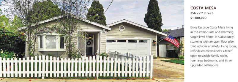 COSTA MESA 256 22 nd Street $1,180,000 Enjoy Eastside Costa Mesa living in this immaculate and charming single-level home. It is absolutely stunning with an open floor plan that includes a tasteful living room, remodeled entertainer’s kitchen open to sizable family room, four large bedrooms, and three upgraded bathrooms. See also