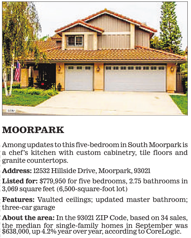 About the area: In the 93021 ZIP Code, based on 34 sales, the median for single-family homes in September was $638,000, up 4.2% year over year, according to CoreLogic.