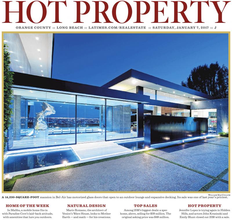 HOT PROPERT Y ORANGE COUNTY :: LONG BEACH :: LATIMES.COM/REALESTATE :: SATURDAY, JANUARY 7, 2017 :: J William MacCollum A 14,230-SQUARE-FOOT mansion in Bel-Air has motorized glass doors that open to an outdoor lounge and expansive decking. Its sale was one of last year’s priciest. HOME OF THE WEEK In Malibu, a mobile home fits in with Paradise Cove’s laid-back attitude, with amenities that lure you outdoors. NATURAL DESIGN Mario Romano, the architect of Venice’s Wave House, looks to Mother Earth — and math — for his creations. TOP SALES Among 2016’s biggest deals: a spec home, above, selling for $39 million. The original asking price was $48 million. HOT PROPERTY Jennifer Lopez is trying again in Hidden Hills, and actors John Krasinski and Emily Blunt closed out 2016 with a sale.