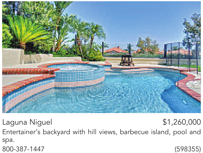 Laguna Niguel $1,260,000 Entertainer’s backyard with hill views, barbecue island, pool and spa.