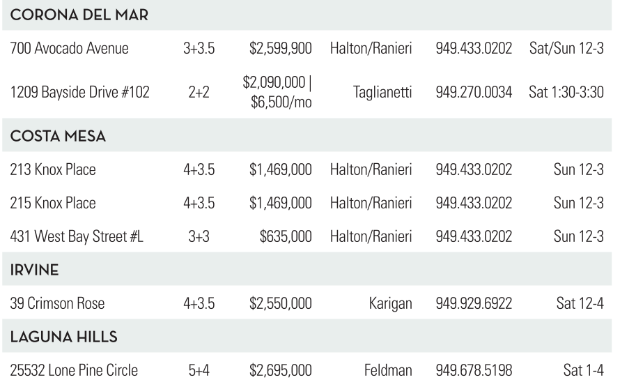 CORONA DEL MAR 700 Avocado Avenue 3+3.5 $2,599,900 Halton/Ranieri 949.433.0202 Sat/Sun 12-3 1209 Bayside Drive #102 2+2 $2,090,000 | $6,500/mo Taglianetti 949.270.0034 Sat 1:30-3:30 COSTA MESA 213 Knox Place 4+3.5 $1,469,000 Halton/Ranieri 949.433.0202 Sun 12-3 215 Knox Place 4+3.5 $1,469,000 Halton/Ranieri 949.433.0202 Sun 12-3 431 West Bay Street #L 3+3 $635,000 Halton/Ranieri 949.433.0202 Sun 12-3 IRVINE 39 Crimson Rose 4+3.5 $2,550,000 Karigan 949.929.6922 Sat 12-4 GUNA HILLS 25532 Lone Pine Circle 5+4 $2,695,000 Feldman 949.678.5198 Sat 1-4 See also