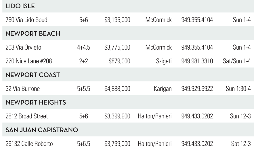 LIDO ISLE 760 ViaLido Soud 5+6 $3,195,000 McCormick 949.355.4104 Sun 1-4 NEWPORTBEACH 208 ViaOrvieto 4+4.5 $3,775,000 McCormick 949.355.4104 Sun 1-4 220 Nice Lane #208 2+2 $879,000 Szigeti 949.981.3310 Sat/Sun 1-4 NEWPORTCOAST 32 ViaBurrone 5+5.5 $4,888,000 Karigan 949.929.6922 Sun 1:30-4 NEWPORTHEIGHTS 2812 Broad Street 5+6 $3,399,900 Halton/Ranieri 949.433.0202 Sun 12-3 SANJUANCAPISTRANO 26132 Calle Roberto 5+6.5 $3,799,000 Halton/Ranieri 949.433.0202 Sat 12-3