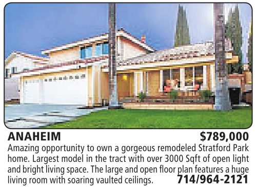 ANAHEIM $789,000 Amazing opportunity toown agorgeous remodeled Stratford Park home. Largest model inthe tract with over 3000 Sqft ofopen light andbrightliving space.The large andopen floorplanfeatures ahuge living room withsoaring vaulted ceilings. 714/964-2121