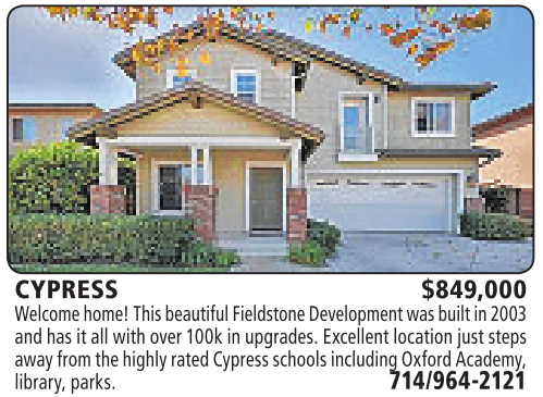 CYPRESS $849,000 Welcome home!ThisbeautifulFieldstone Developmentwas builtin2003 and hasitall with over100kinupgrades. Excellent location just steps away from thehighlyrated Cypress schools including OxfordAcademy, library, parks. 714/964-2121