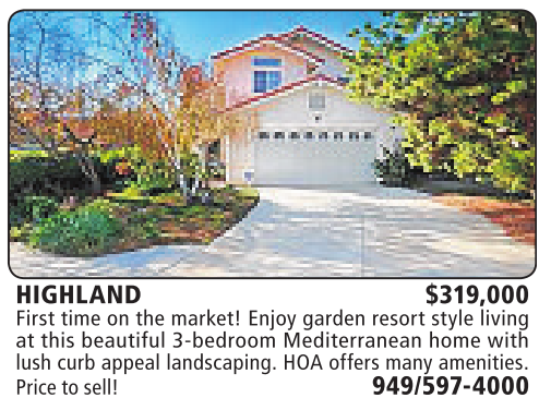 HIGHLAND $319,000 First time on the market! Enjoy garden resort style living at this beautiful 3-bedroom Mediterranean home with lush curb appeal landscaping. HOA offers many amenities. Pricetosell! 949/597-4000