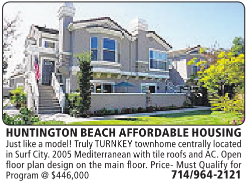 HUNTINGTON BEACHAFFORDABLEHOUSING Just like amodel! TrulyTURNKEYtownhome centrally located in Surf City.2005Mediterraneanwithtileroofs and AC.Open floor plan design onthe main floor. Price- Must Qualify for Program @$446,000 714/964-2121