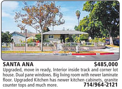 SANTA ANA $485,000 Upgraded, move in ready, Interior inside track and corner lot house. Dual pane windows.Big living room with newerlaminate floor. Upgraded Kitchen has newer kitchen cabinets, granite counter tops andmuch more. 714/964-2121
