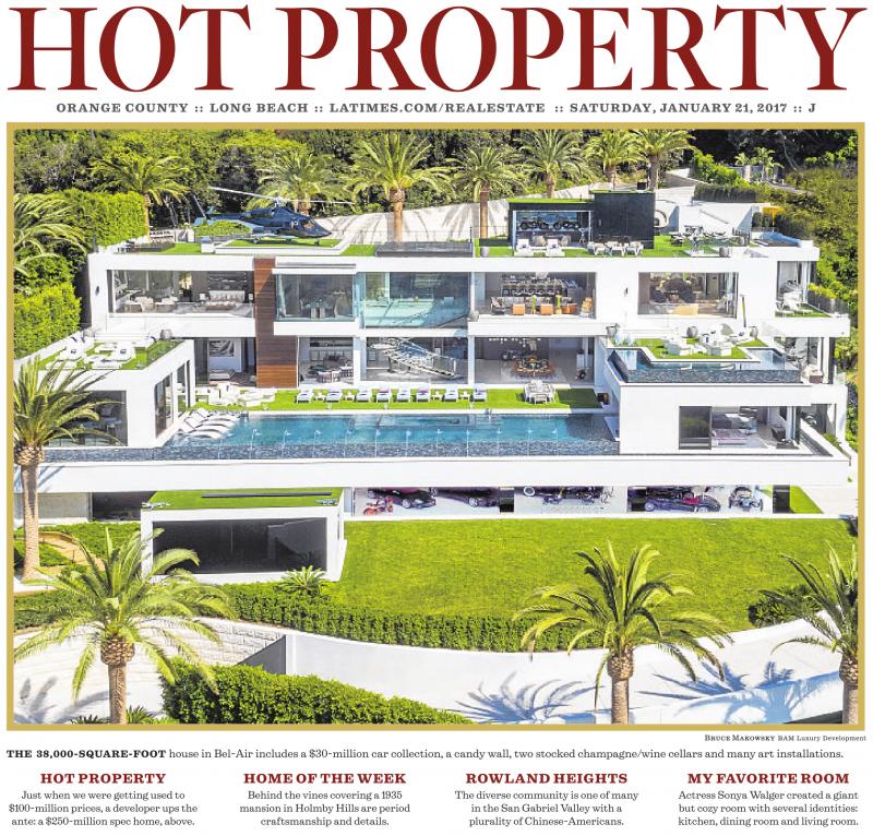 HOT PROPERT Y ORANGE COUNTY :: LONG BEACH :: LATIMES.COM/REALESTATE :: SATURDAY, JANUARY 21, 2017 :: J Bruce Makowsky BAM Luxury Development THE 38,000-SQUARE-FOOT house in Bel-Air includes a $30-million car collection, a candy wall, two stocked champagne/wine cellars and many art installations. HOT PROPERTY Just when we were getting used to $100-million prices, a developer ups the ante: a $250-million spec home, above. HOME OF THE WEEK Behind the vines covering a 1935 mansion in Holmby Hills are period craftsmanship and details. ROWLAND HEIGHTS The diverse community is one of many in the San Gabriel Valley with a plurality of Chinese-Americans. MY FAVORITE ROOM Actress Sonya Walger created a giant but cozy room with several identities: kitchen, dining room and living room.