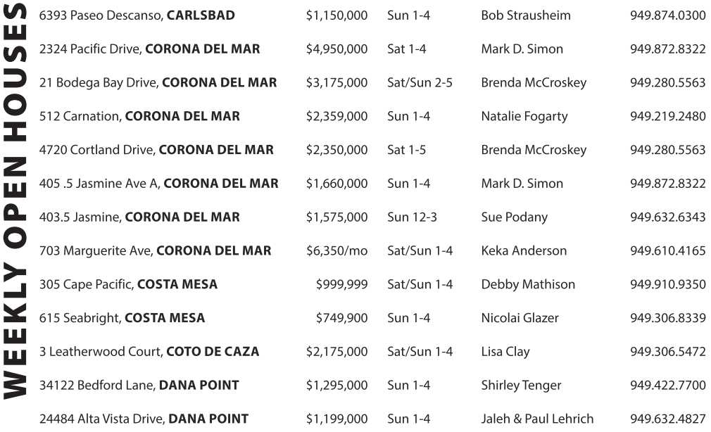 4720 Cortland Drive, CORONA DEL MAR $2,350,000 Sat 1-5 Brenda McCroskey 949.280.5563