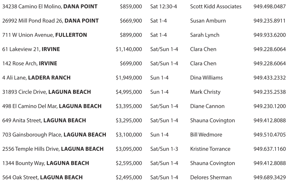 26992 Mill Pond Road 26, DANA POINT $669,900 Sat 1-4 Susan Amburn 949.235.8911