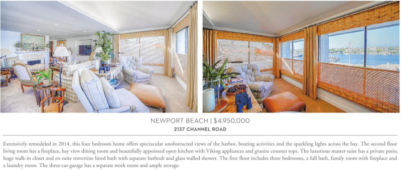 NEWPORT BEACH | $4,950,000 2137 channel road Extensively remodeled in 2014, this four bedroom home offers spectacular unobstructed views of the harbor, boating activities and the sparkling lights across the bay. The second floor living room has a fireplace, bay view dining room and beautifully appointed open kitchen with Viking appliances and granite counter tops. The luxurious master suite has a private patio, huge walk-in closet and en suite travertine lined bath with separate bathtub and glass walled shower. The first floor includes three bedrooms, a full bath, family room with fireplace and a laundry room. The three-car garage has a separate work room and ample storage.