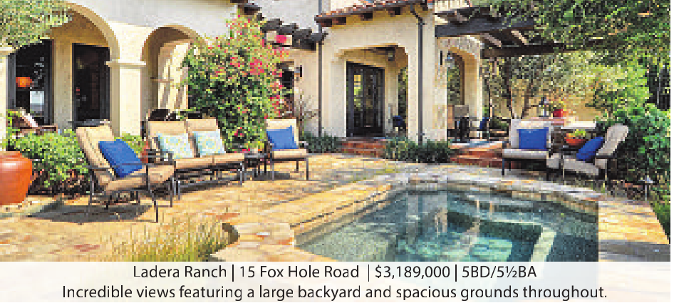 Ladera Ranch | 15 Fox Hole Road | $3,189,000 | 5BD/5½BA Incredible views featuring a large backyard and spacious grounds throughout.