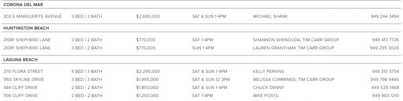 CORONA DEL MAR 302.5 MARGUERITE AVENUE 3 BED | 3 BATH $2,695,000 SAT & SUN 1-4PM MICHAEL SHANK 949 244 3494 HUNTINGTON BEACH 21081 SHEPHERD LANE 3 BED | 2 BATH $770,000 SAT 1-4PM SHANNON SHENOUDA, TIM CARR GROUP 949 413 7726 21081 SHEPHERD LANE 3 BED | 2 BATH $770,000 SUN 1-4PM LAUREN GRANTHAM, TIM CARR GROUP 949 295 3026 LAGUNA BEACH 370 FLORA STREET 4 BED | 3 BATH $2,295,000 SAT & SUN 1-4PM KELLY PERKINS 949 310 3754 1160 SKYLINE DRIVE 3 BED | 3 BATH $1,995,000 SAT & SUN 12-3PM MELISSA CUMMINGS, TIM CARR GROUP 949 798 9466 484 CLIFF DRIVE 2 BED | 2 BATH $1,850,000 SAT & SUN 1-4PM CHUCK DENNY 949 525 1468 706 CLIFF DRIVE 2 BED | 2 BATH $1,250,000 SAT 1-4PM MIKE POSTIL 949 903 1210 See also