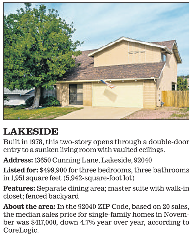 About the area: In the 92040 ZIP Code, based on 20 sales, the median sales price for single-family homes in November was $417,000, down 4.7% year over year, according to CoreLogic.
