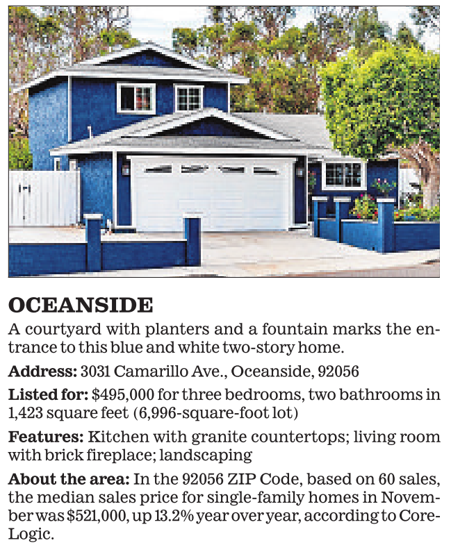 About the area: In the 92056 ZIP Code, based on 60 sales, the median sales price for single-family homes in November was $521,000, up13.2% year over year, according to Core- Logic.