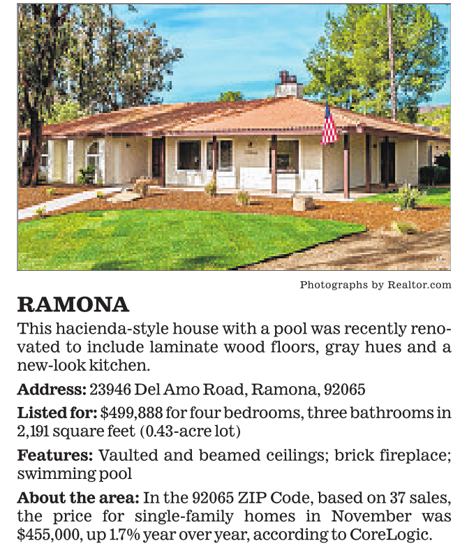 RAMONA This hacienda-style house with a pool was recently renovated to include laminate wood floors, gray hues and a new-look kitchen. Address: 23946 Del Amo Road, Ramona, 92065 Photographs by Realtor.com Listed for: $499,888 for four bedrooms, three bathrooms in 2,191 square feet (0.43-acre lot) Features: Vaulted and beamed ceilings; brick fireplace; swimming pool About the area: In the 92065 ZIP Code, based on 37 sales, the price for single-family homes in November was $455,000, up 1.7% year over year, according to CoreLogic. See also