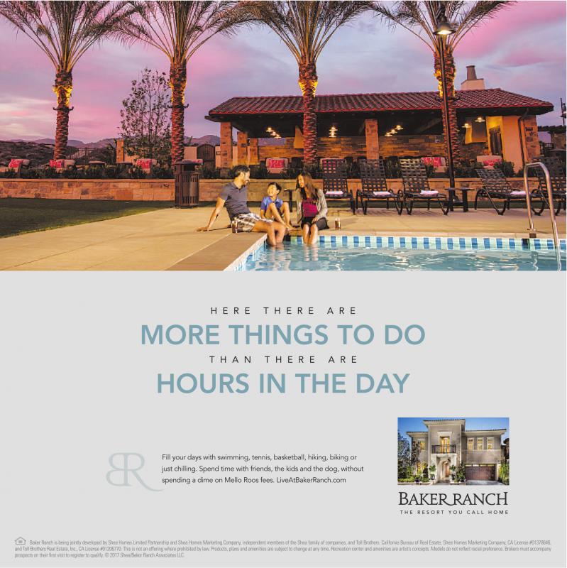 H E R E T H E R E A R E MORE THINGS TO DO T H A N T H E R E A R E HOURS IN THE DAY Fill your days with swimming, tennis, basketball, hiking, biking or just chilling. Spend time with friends, the kids and the dog, without spending a dime on Mello Roos fees. LiveAtBakerRanch.com T H E R E S O R T Y O U C A L L H O M E Baker Ranch is beingjointly developed by Shea Homes Limited Partnershipand Shea HomesMarketing Company,independent members of the Shea family of companies, andTollBrothers. CaliforniaBureau of Real Estate,Shea HomesMarketingCompany,CALicense #01378646, and Toll Brothers Real Estate, Inc., CA License #01206770. This is notanoffering where prohibitedbylaw.Products, plansand amenities are subject to change at anytime. Recreationcenter andamenitiesare artist’sconcepts. Models do notreflectracial preference. Brokersmust accompany prospects on their first visittoregister to qualify.©2017Shea/Baker RanchAssociates LLC.