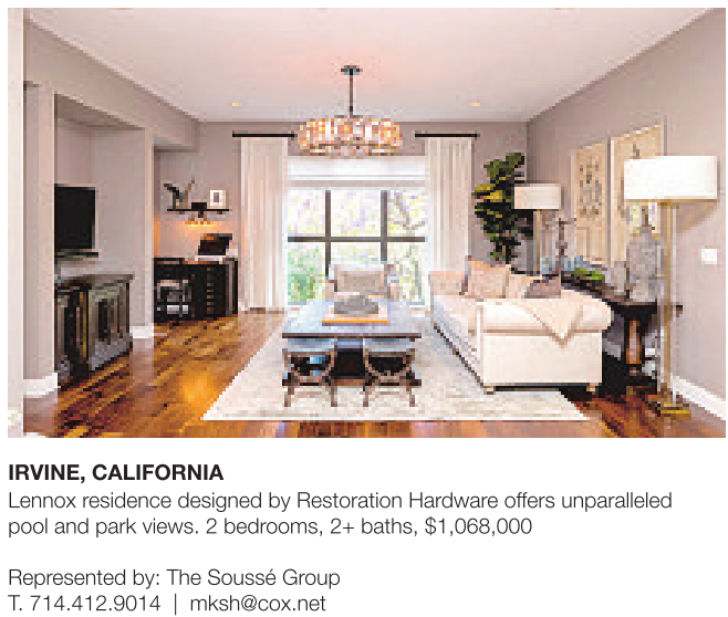 IRVINE, CALIFORNIA Lennox residence designed by Restoration Hardware offers unparalleled pool and park views. 2bedrooms, 2+ baths, $1,068,000