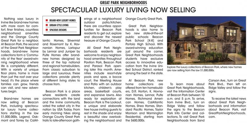 To receive the latest news about Great Park Neighborhoods and information about Beacon Park, visit GreatParkNeighborhoods. com.