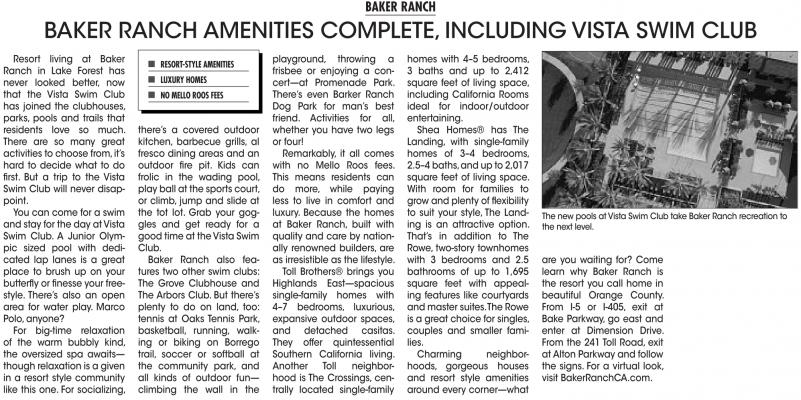 BAKER RANCH AMENITIES COMPLETE, INCLUDING VISTA SWIM CLUB