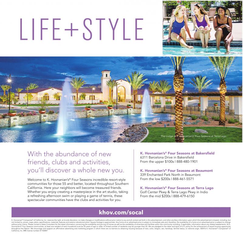 K. Hovnanian ® Companies ® of California, Inc. reserves the right, at its sole discretion, to make changes or modifications without prior notice to any and all content set forth in this advertisement, and other ancillary information upon which this advertisement is based, including, but not limited to, prices, maps, plans, specifications, materials, features and exterior elevations/colors. Square footage is approximate. Any home at an advertised price is subject to immediate sale and, therefore, the availability of ahome at an advertised price is subject to change without prior notice. Please contact aSales Consultant for the latest information concerning the availability and pricing of homes as well as the availability of amenities and facilities within the community including, if applicable, information about any related assessments. At K. Hovnanian’s ® Four Seasons communities, at least one resident of each household must be 55 years of age or older. Alimited number of residents may be younger than 55. We are pledged to the letter and spirit of U.S. policy for the achievement of equal housing opportunity throughout the Nation. We encourage and support an affirmative advertising and marketing program in which there are no barriers to obtaining housing because of race, color, religion, sex, handicap, familial status, or national origin. ©2016 K. Hovnanian ® Companies ® of California, Inc. BRE license number 01183847