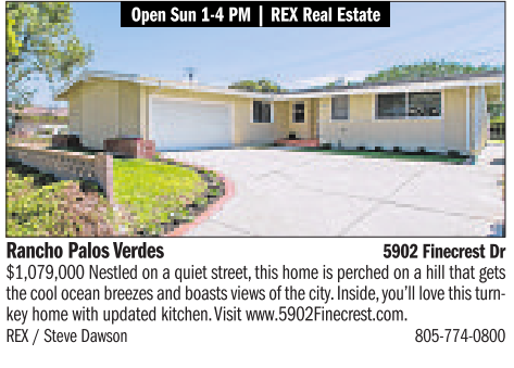 Open Sun 1-4 PM |REX Real Estate Rancho Palos Verdes 5902 Finecrest Dr $1,079,000 Nestled on aquiet street,thishomeisperched on ahill that gets the cool ocean breezes and boasts views of the city.Inside,you’ll love this turnkeyhomewith updated kitchen.Visit www.5902Finecrest.com. REX /Steve Dawson 805-774-0800