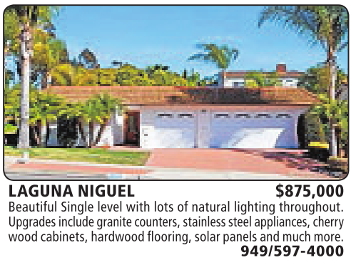 LAGUNA NIGUEL $875,000 Beautiful Single level with lots ofnatural lighting throughout. Upgrades includegranitecounters,stainlesssteel appliances,cherry wood cabinets, hardwood flooring,solar panels andmuchmore.